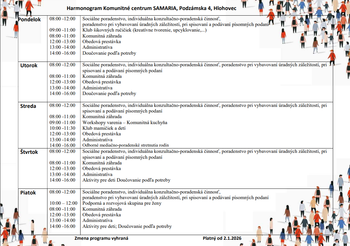 Týždenný plán činností komunitného centra